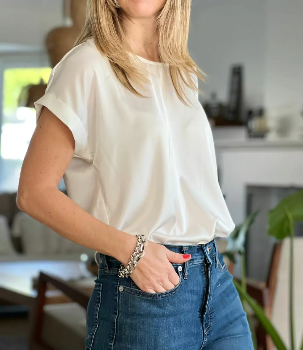 Descubrí la Blusa Cora, con su diseño de manga corta y tejido de raso, es perfecta para cualquier ocasión, desde reuniones informales hasta eventos más formales.