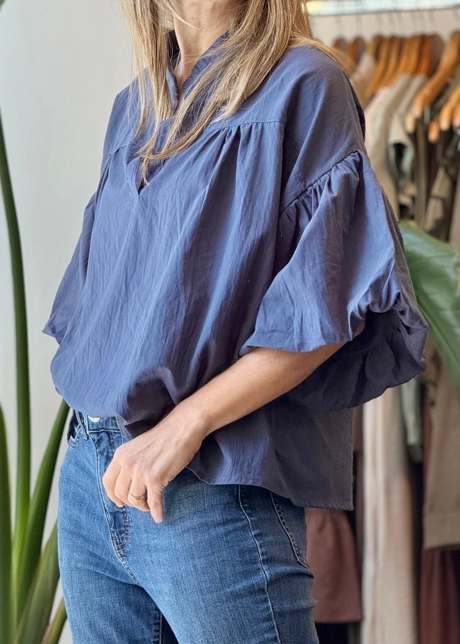 Blusa de gasa de algodon super liviana , cuello mao sin botones manga 3/4 globo.