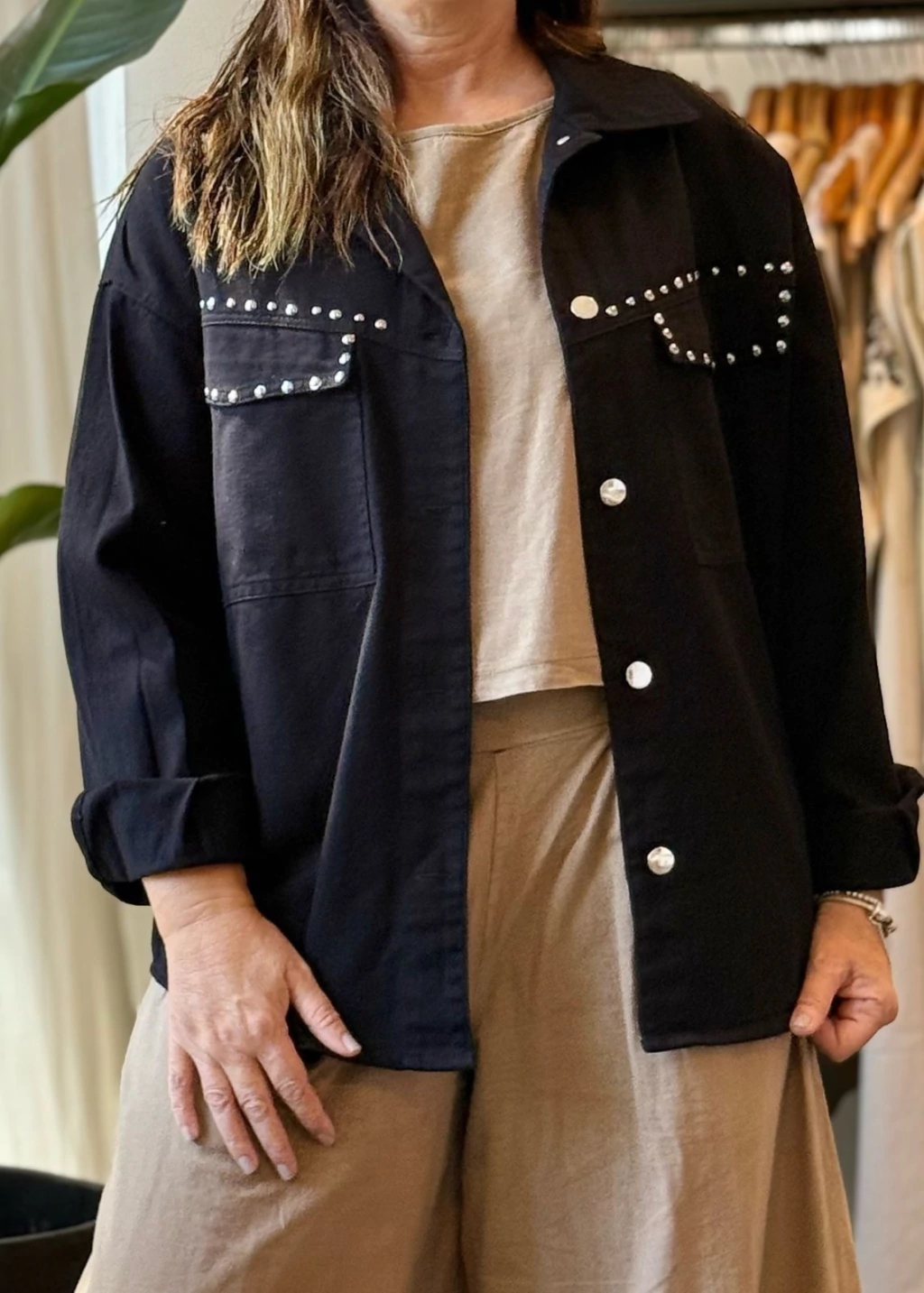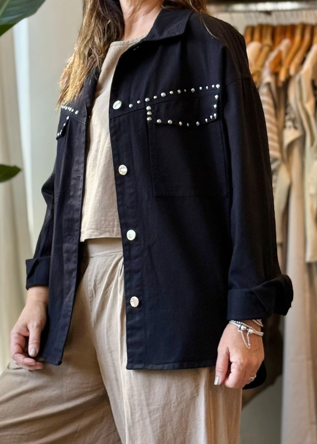 Esta campera es perfecta para cualquier ocasión, con detalle de tachitas. Posee bolsillos delanteros invisibles y botones plateados al frente y en puños.
