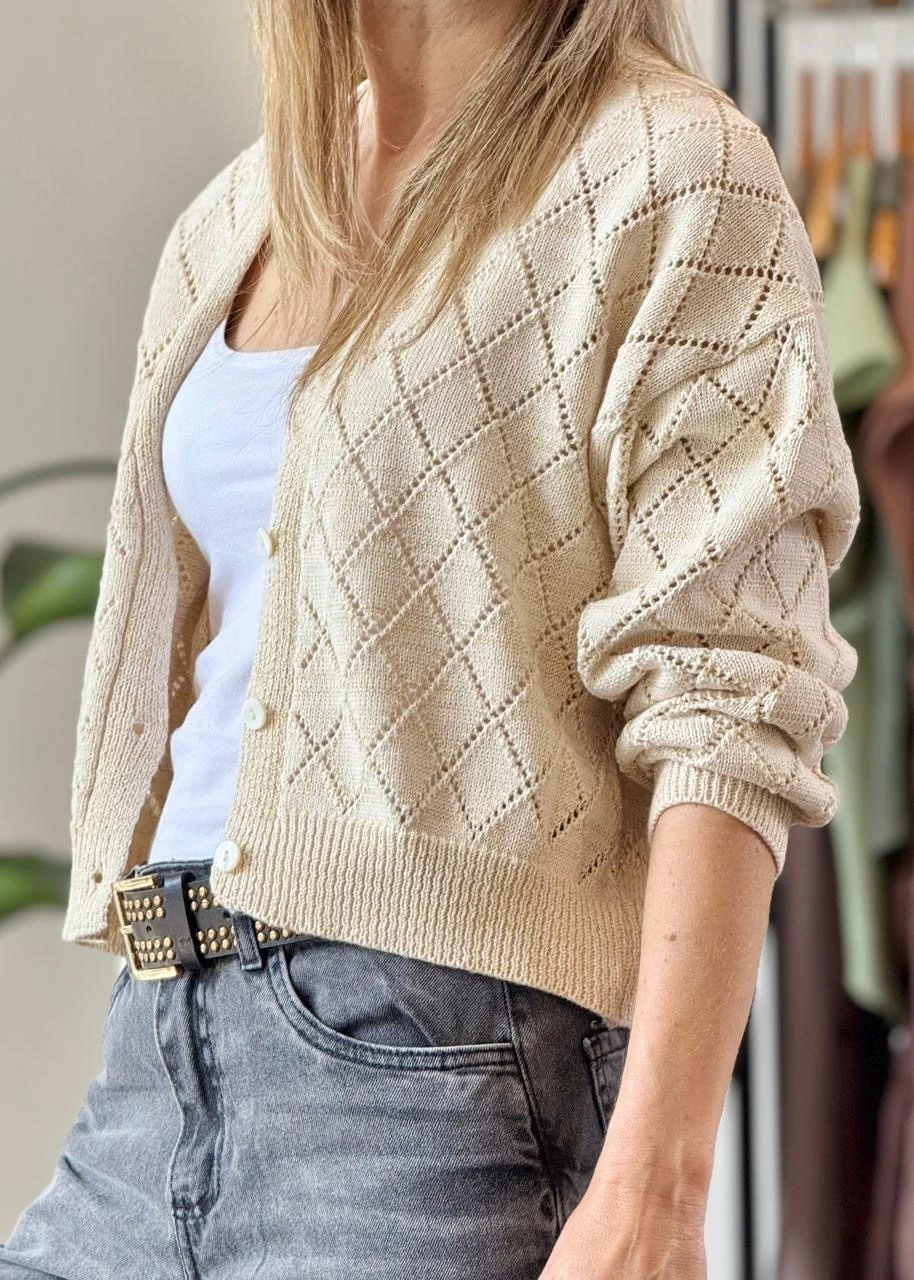 Cárdigan con tejido calado, en forma de rombos ,con hilos de lurex dorado.