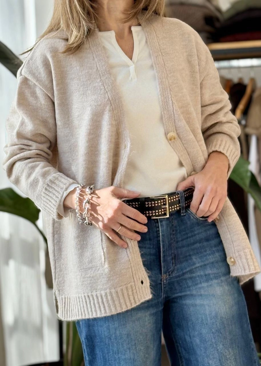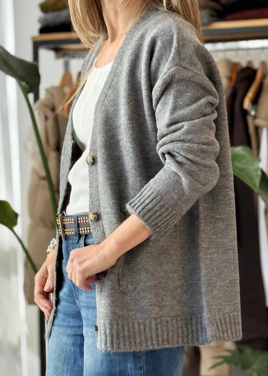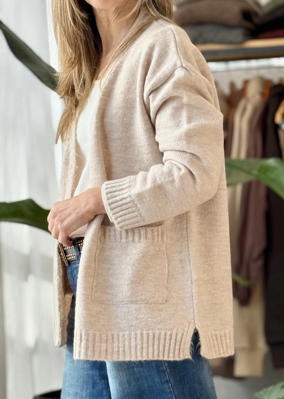 El Cardigan Mirelli es el aliado perfecto para mantenerte abrigada y con estilo. Su diseño clásico con botones. bolsillos y cuello v, lo convierte en una prenda práctica para cualquier ocasión.