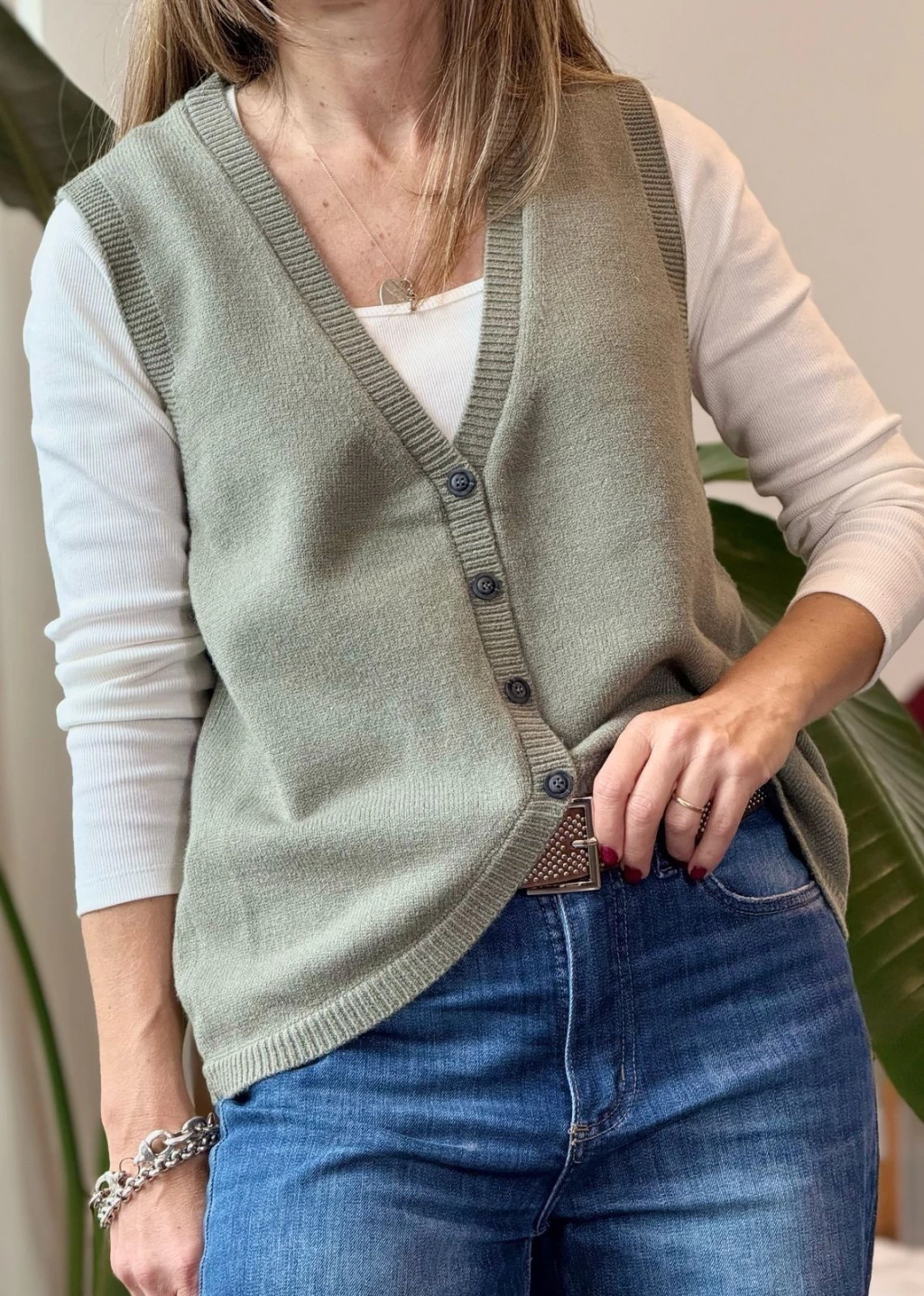Chaleco de bremer con botones y terminación redondeada, una prenda que combina estilo y comodidad. Este chaleco es perfecto para quienes buscan estar abrigadas y comodas .