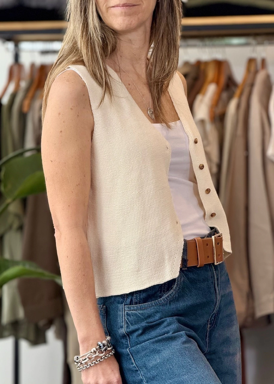 Chaleco de algodon con botones y terminación redondeada, una prenda que combina estilo y comodidad.