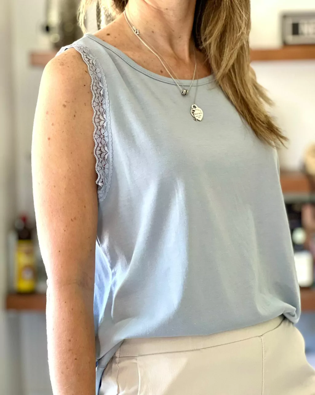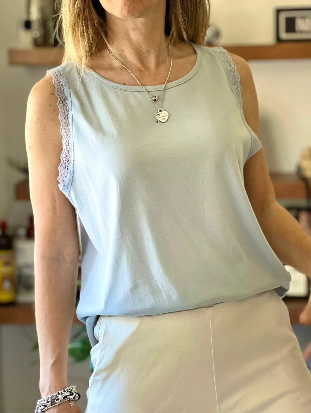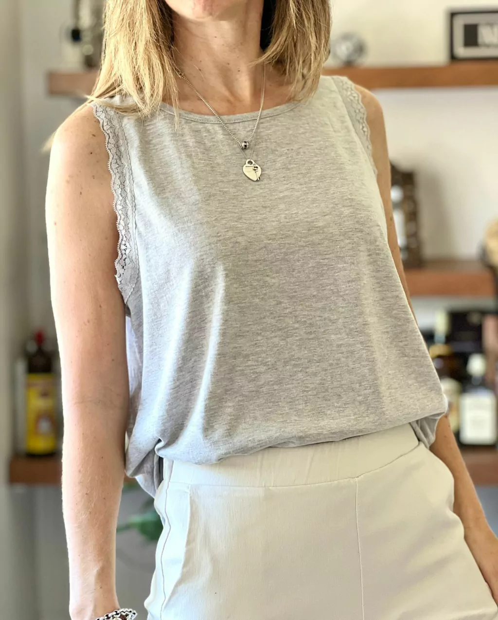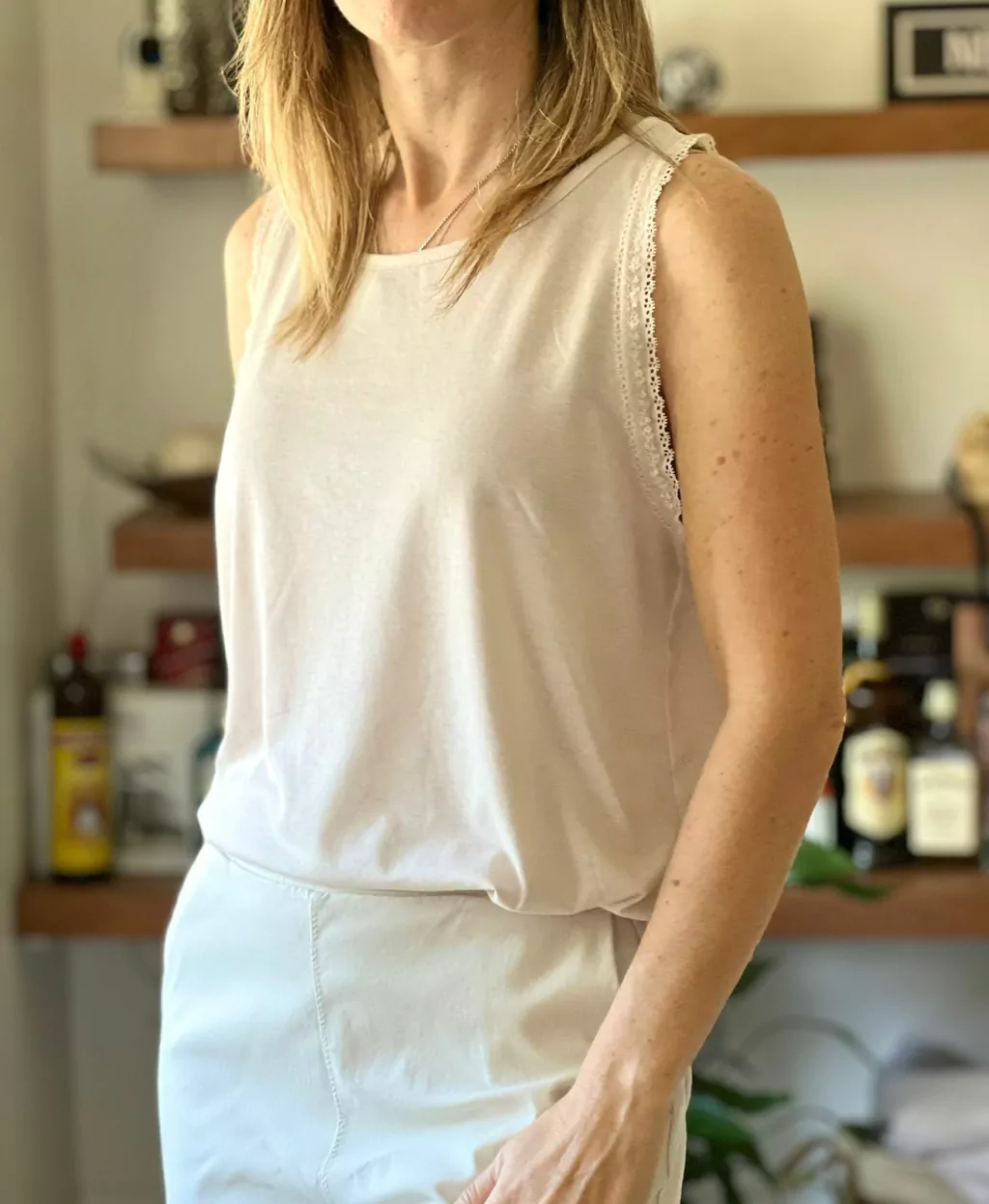 Remera sin mangas cuello redondo con puntillas de nylon y terminación redondeada.