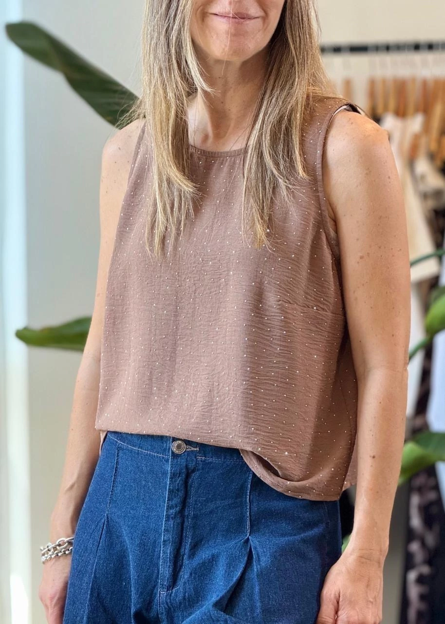 Blusa sin mangas con pequeñas chispas de brillo en la parte de adelante ,perfecta para cualquier ocasión.