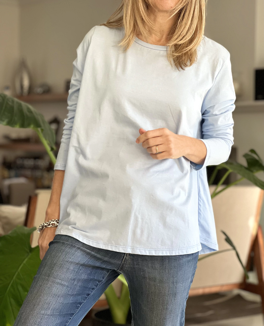 Remera clásica, manga larga evase, con terminación redondeada.