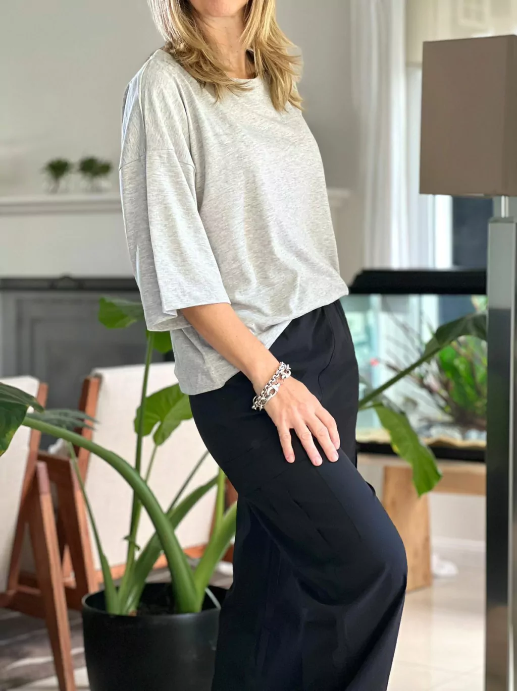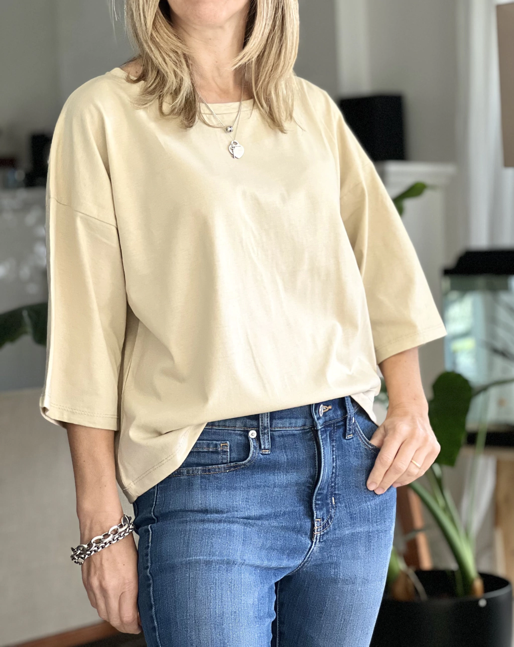 Corte ancho, cuello redondo que le da un toque clásico. Manga 3/4 ideal para cualquier temporada. Jersey de algodón suave y liviano, que te brinda confort durante todo el día.