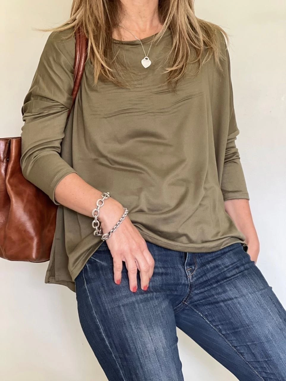 Remera modelo oversize manga 3/4, con dos tajitos en la base y cuello redondo.