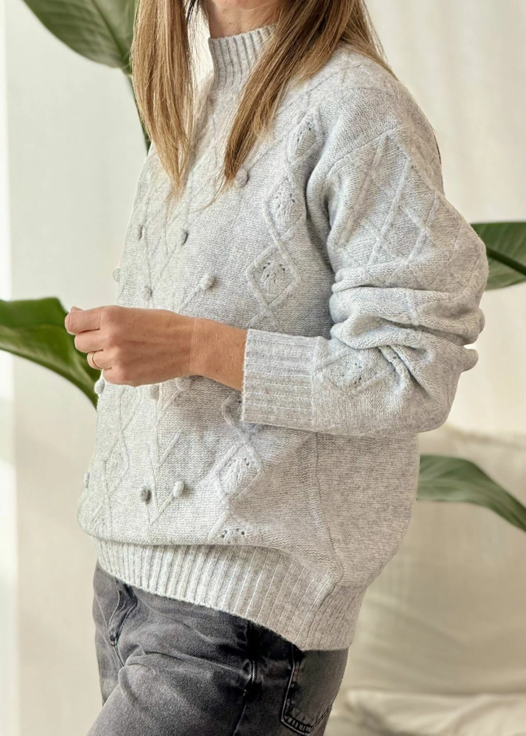 Este sweater súper abrigado tejido con rombos y motas en frente y mangas