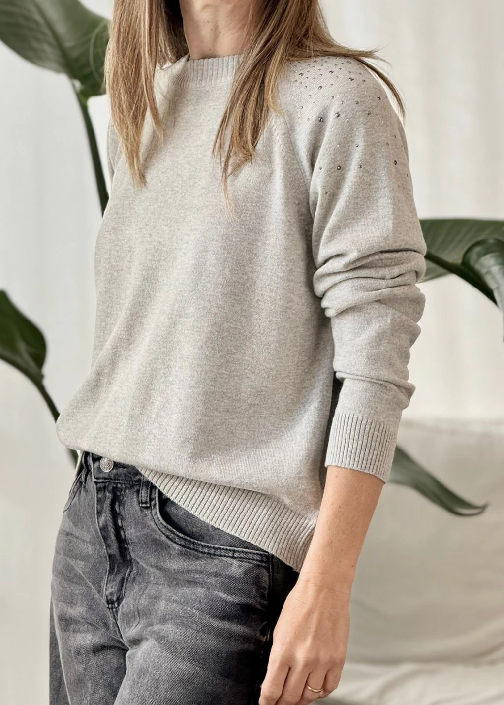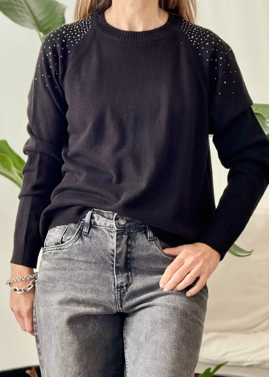 Sweater cuello redondo, manga ranglan clásico con ribetes acanalados en el dobladillo y los puños para un ajuste más ceñido y duradero.Con un detalle de tachas en los hombros que lo hace unico.