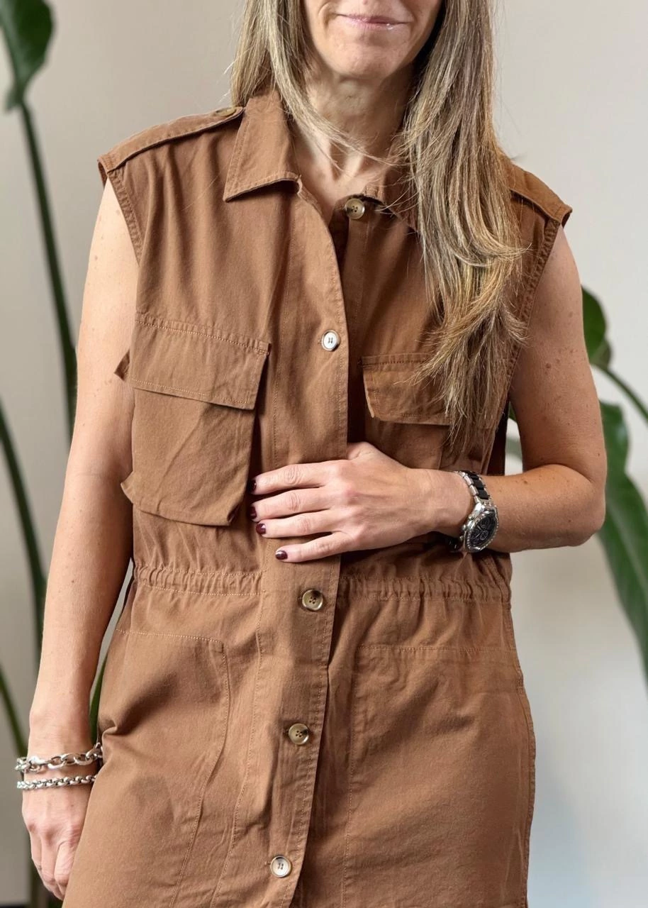 Vestido corto tipo chemise de gabardina liviana ,con cordon para ajustar la cintura y botones al tono.